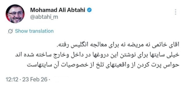 محمدعلی ابطحی رئیس دفتر رئیس جمهوری در دولت هشتم (اصلاحات) در حساب کاربری خود در شبکه اجتماعی ایکس نوشت: